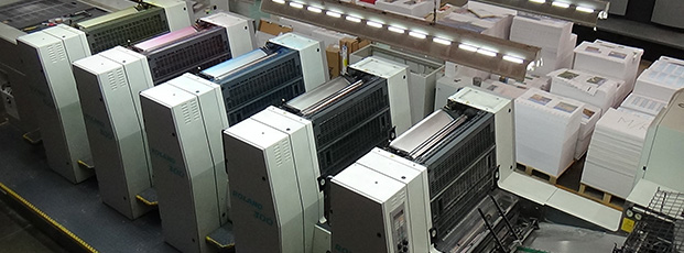 A skilled machine operator prepares the press for the print job. This process takes around 30 minutes and involves filling of the ink ducts, loading paper, and setting up the plates. This is called a ‘make ready’. During the print run, a print minder will make regular quality checks on the press, adjusting ink balances as appropriate to match specific ink densities.
