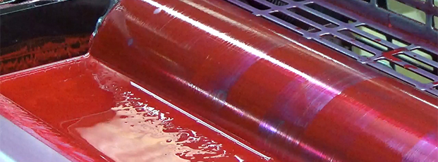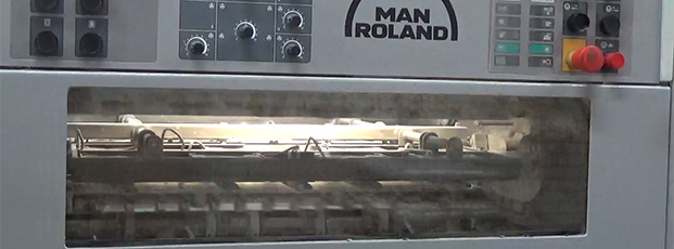 As the machine is started up, paper is fed by the feeder and kept in position by lays on a feeder board. There are three cylinders on each colour unit – a plate cylinder, a blanket cylinder, and an impression cylinder. The cylinders rotate, taking the plate first past the dampening rollers where water is applied, then past the ink rollers. Litho printing is based on the principle that some substances attract water (hydrophilic) and others repel water (hydrophobic). As ink and water don’t mix, ink is only applied to the dry areas on the plate.