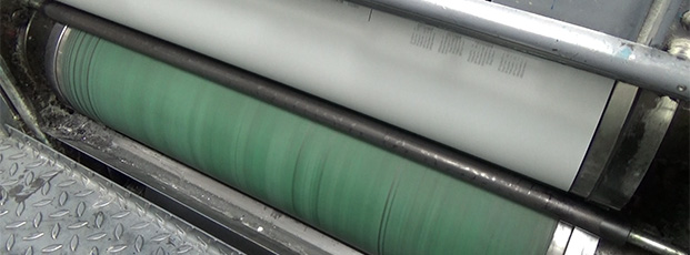 The blanket cylinder turns in the opposite direction and prints the image the correct way around onto a sheet of paper under pressure between the blanket and impression cylinders.